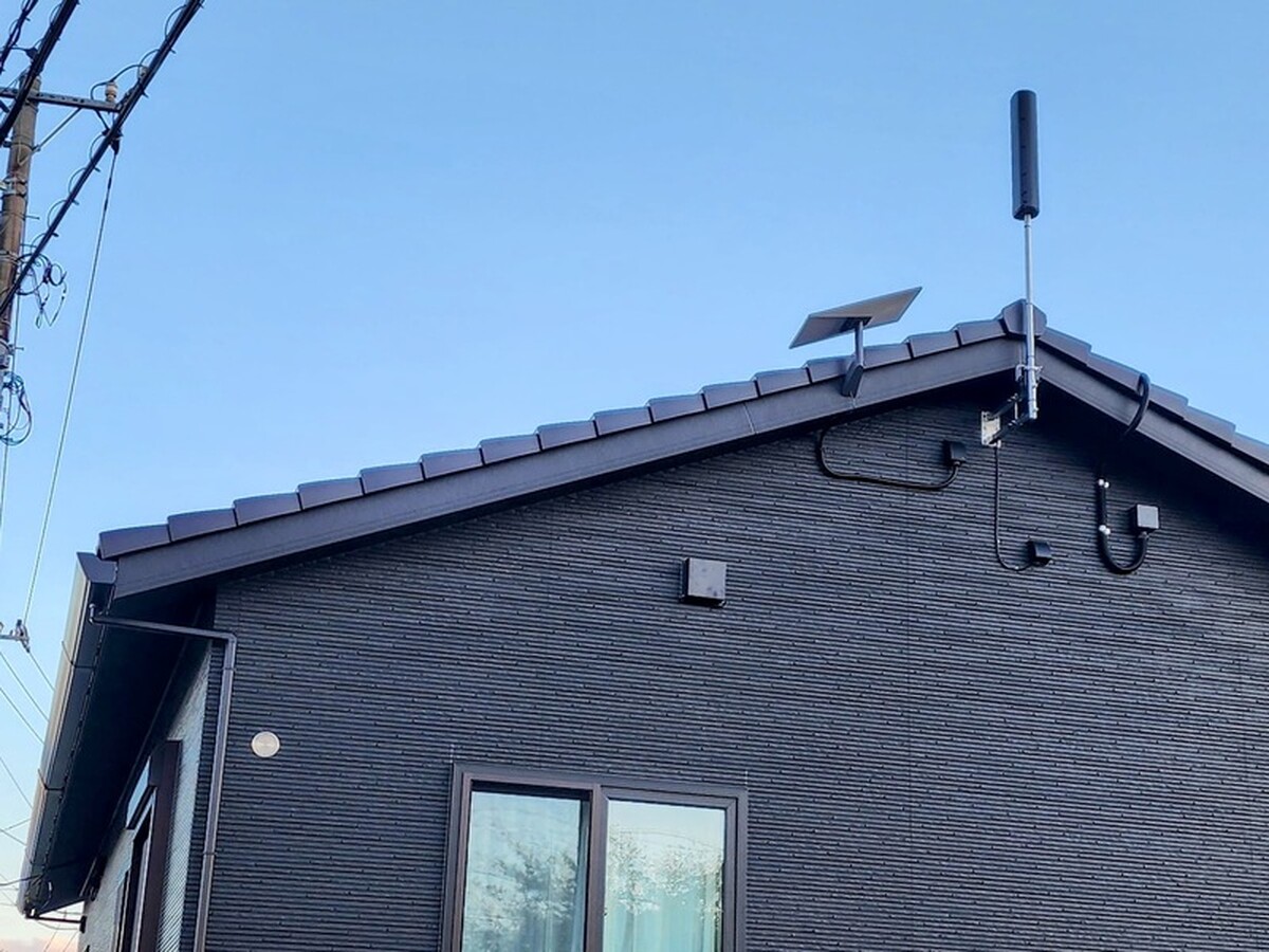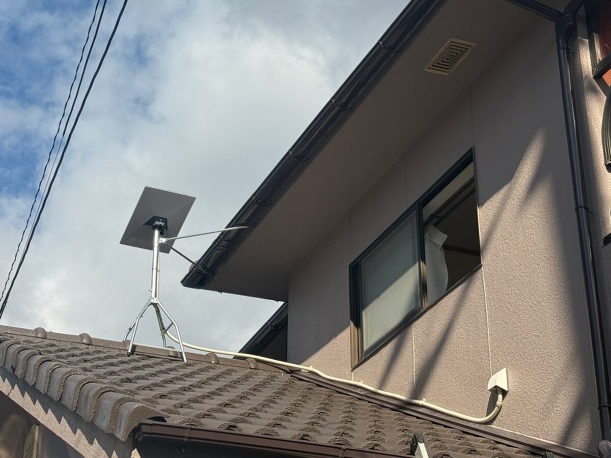 - 今回の工事は、愛媛県松山市の事例です。本工事では2Fで使用されます。現状、別でインターネットを使用されていましたが、2Fまで電波が届きにくいとの事で、2Fへ単独でのインターネット使用が目的になります。アンテナは、屋根馬を使用し壁面から配線を屋内へ通す施工になります。屋根馬の固定は、支持金物を2Fの屋根に固定し風でも動かないように固定しています。通常は針金で屋根馬を固定します。針金の場合四方より支持し通常のアンテナのようになりますが、屋根が2段であれば今回のような工事も可能になりますので、今後スターリンク導入の方の選択肢の1つになればと思います。